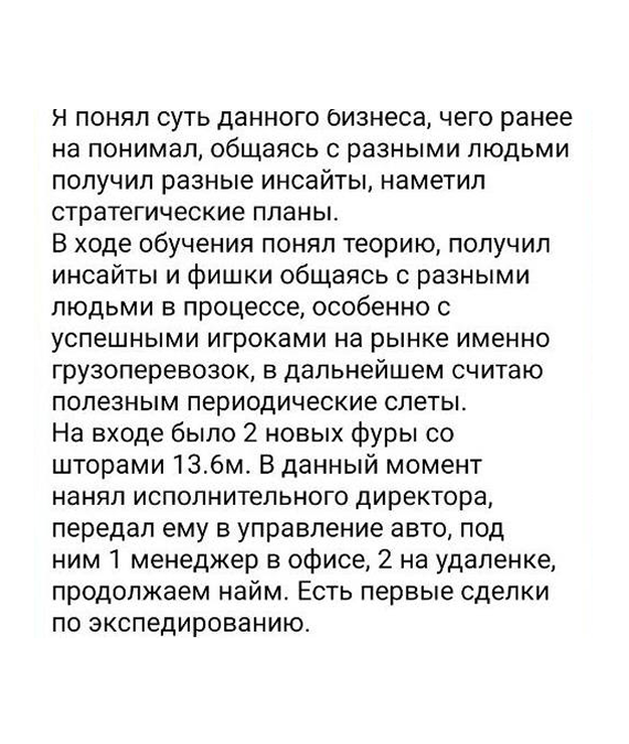 Получил структуру организации экспедирования, мотивация сотрудников, какие необходимы отделы для экспедирования. Новые знакомства, сообщество. Посетил все встречи, из каждой что то для себя выделил»